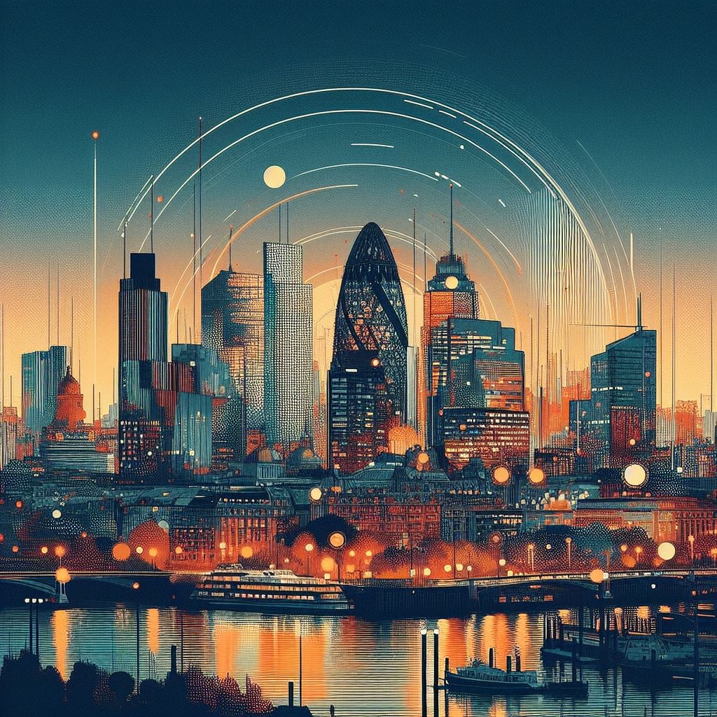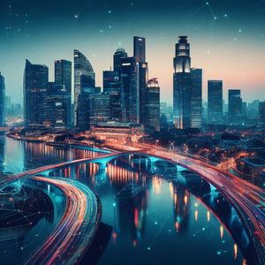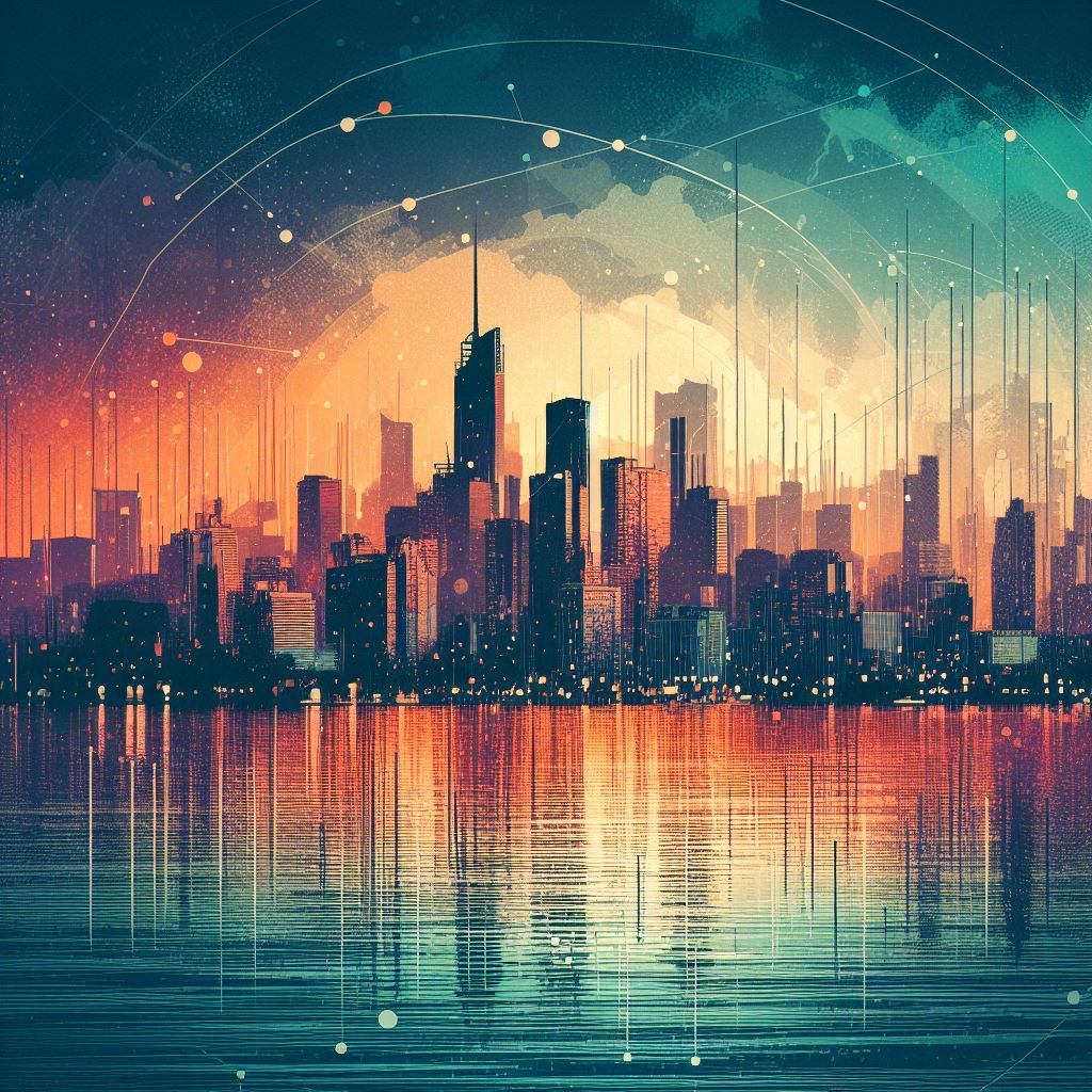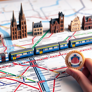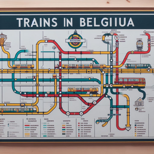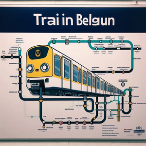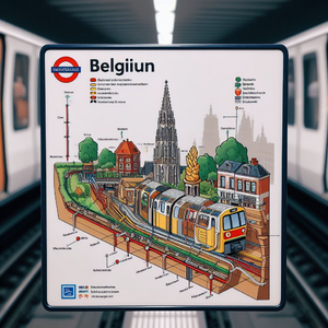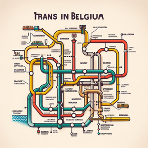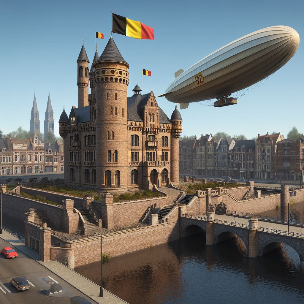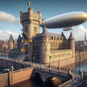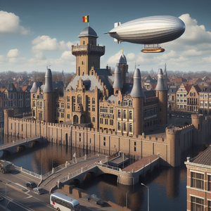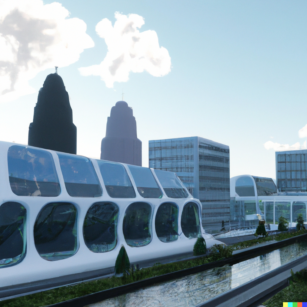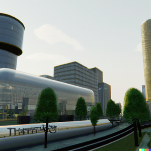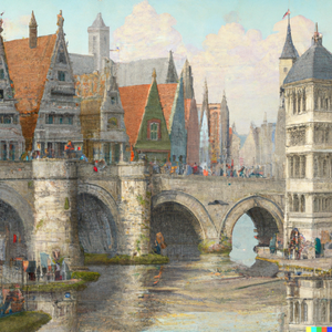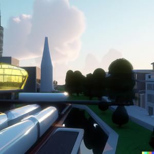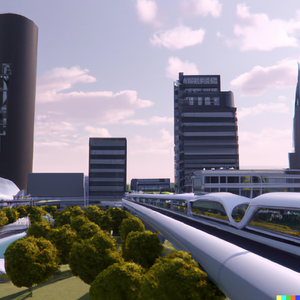 The city of Ghent in the far future, with glass buildings, hyperloop train, and trees. Daylight, soft lighting. Perspective is from afar, with visible...