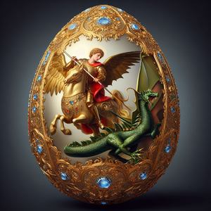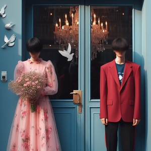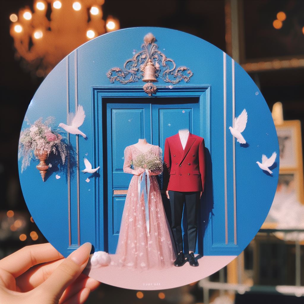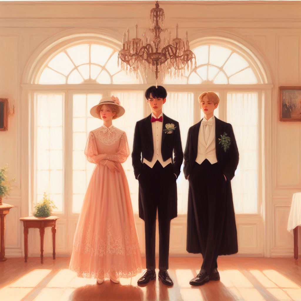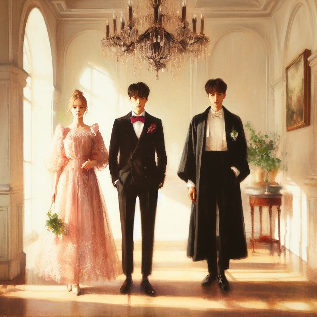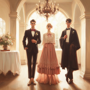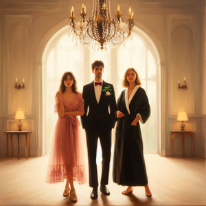 Illustration of a grand party scene in a vast ballroom. Elegant chandeliers hang from the ceiling, casting a warm glow. In the center, there's a large...