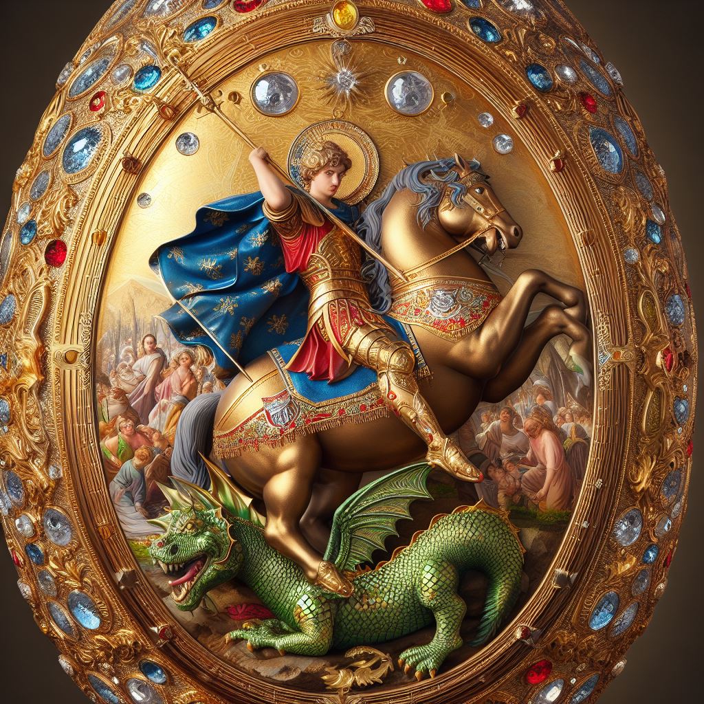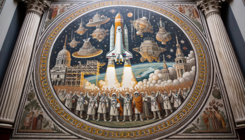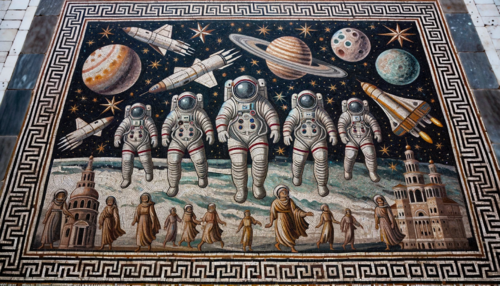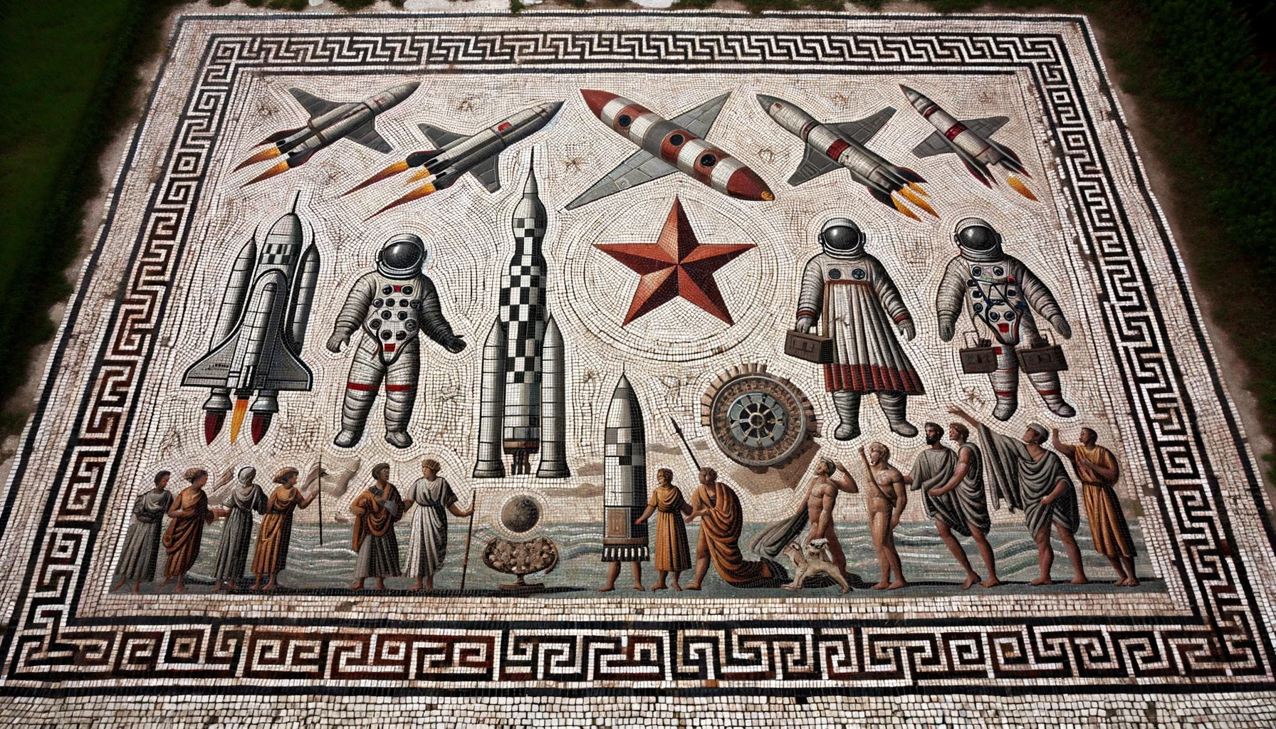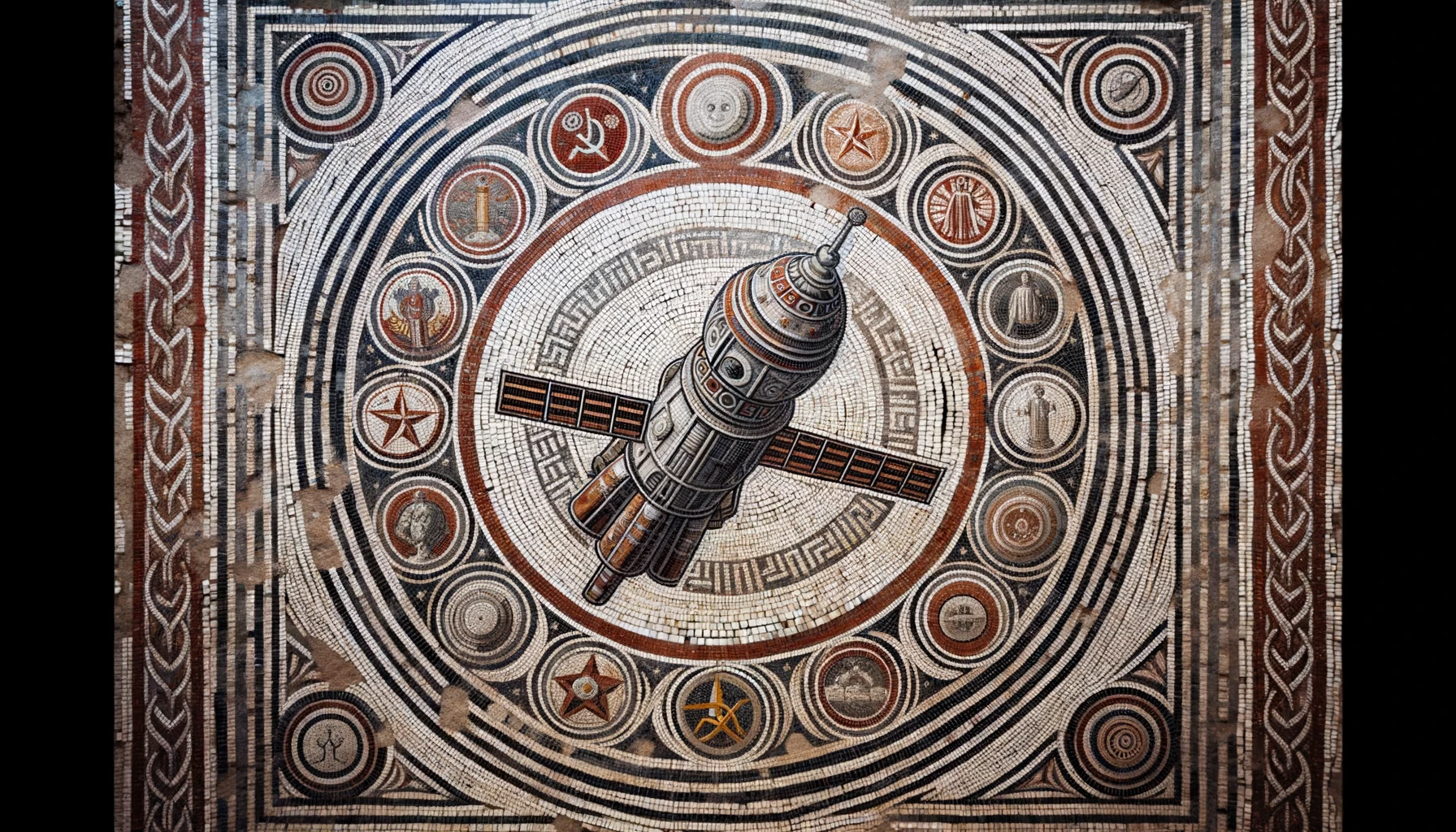 Photo of an ancient-looking Roman mosaic that tells the story of the Soviet space program. Cosmonauts, rockets, and the red star emblem are all...