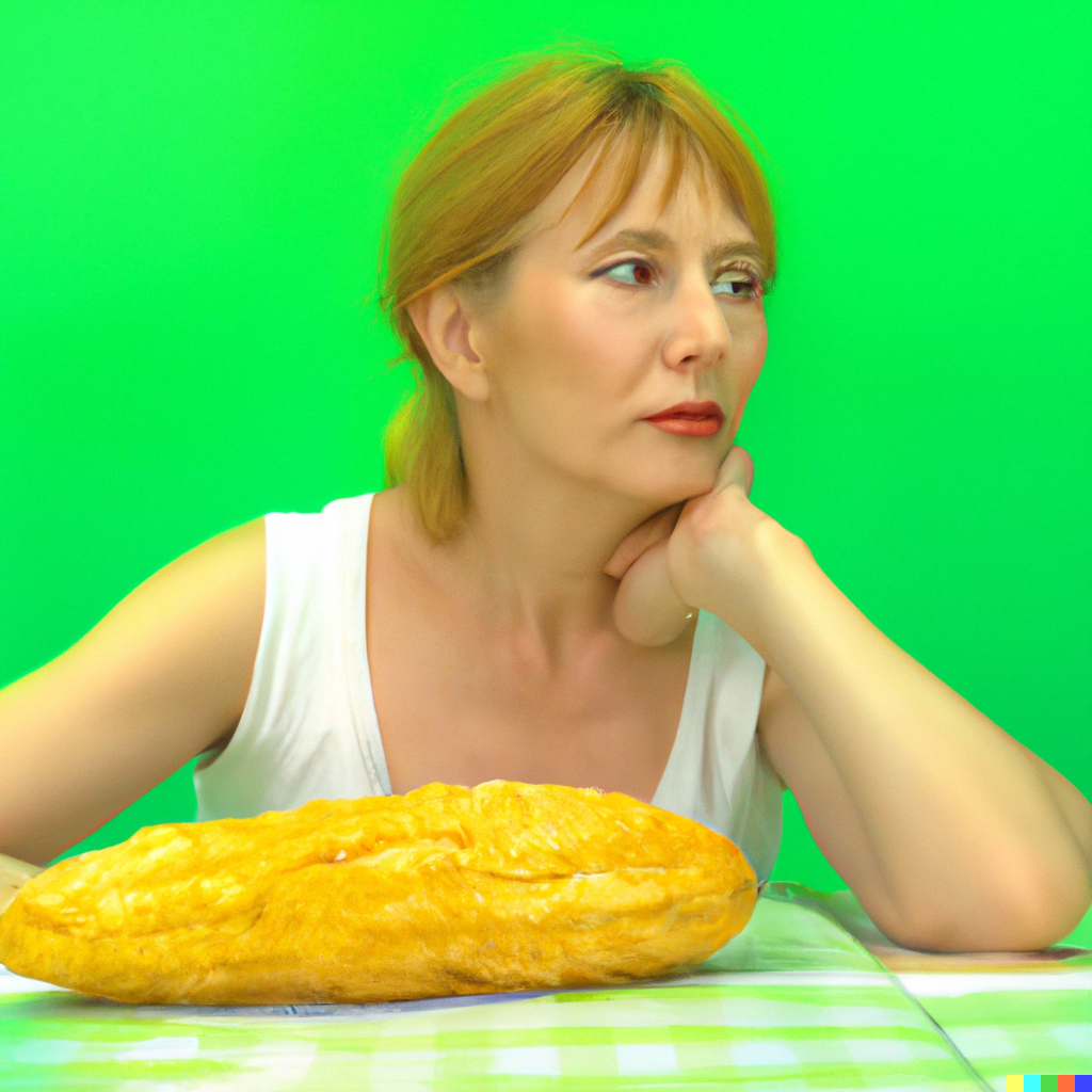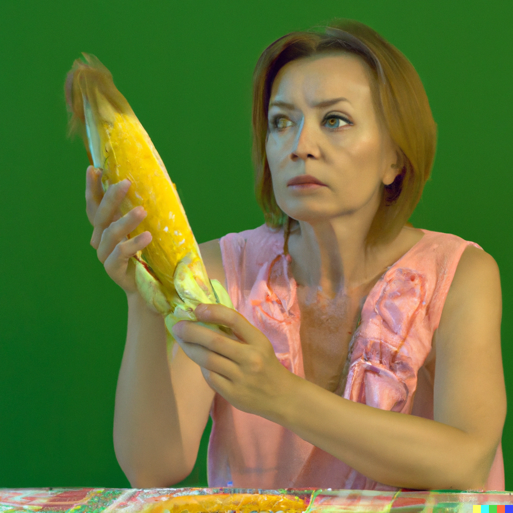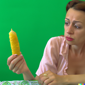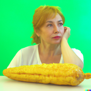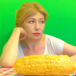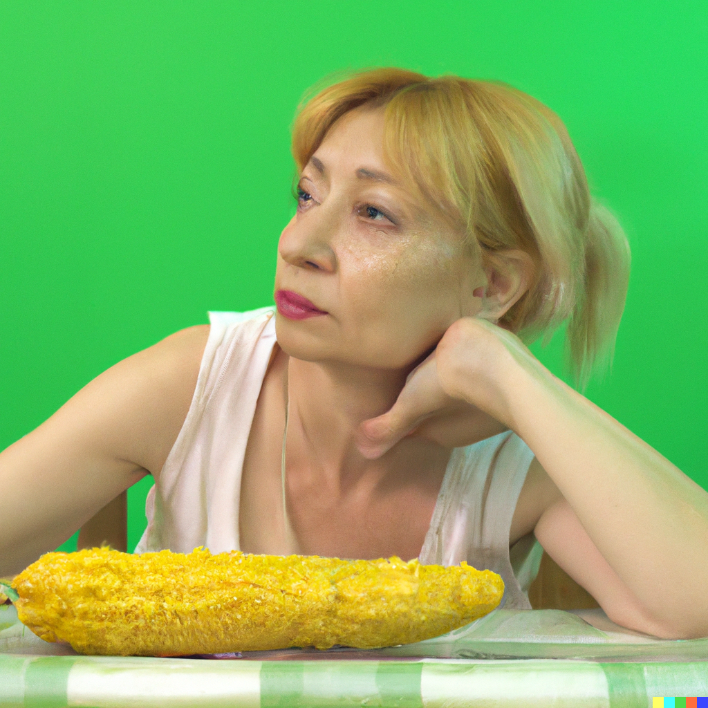 A housewife looking forlornly at a bright yellow ear of corn on a vivid green table in front of her. Realistic photograph 4k