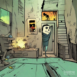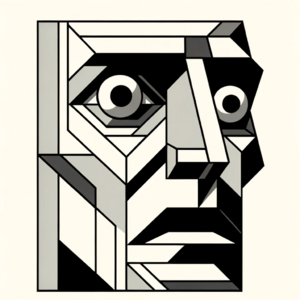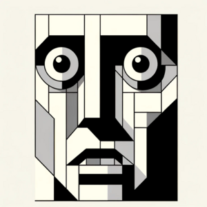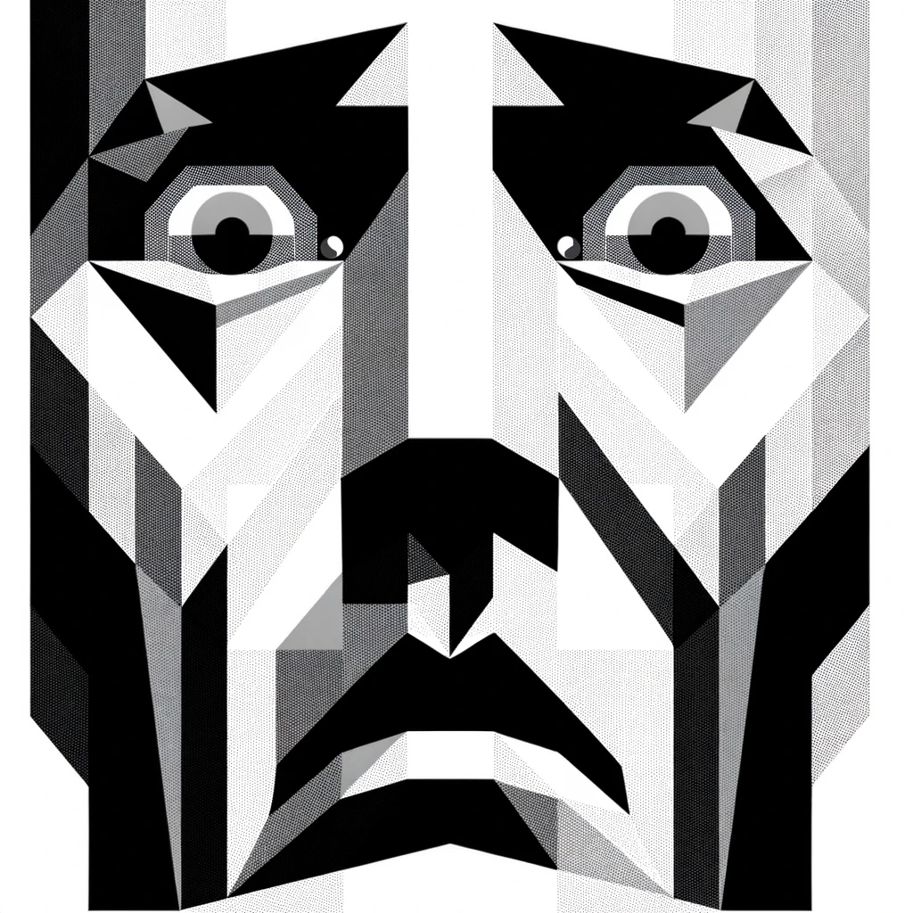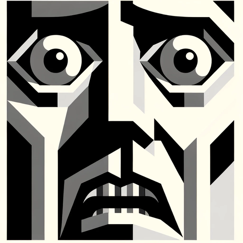 Geometric Bauhaus-style illustration depicting a fearful face. The face exudes a strong sense of anxiety, with notably scrunched eyes and tense facial...