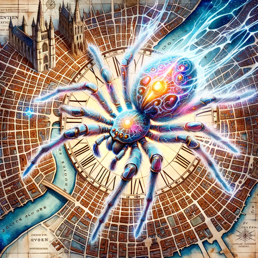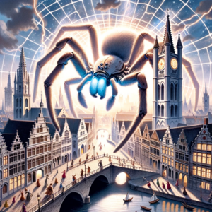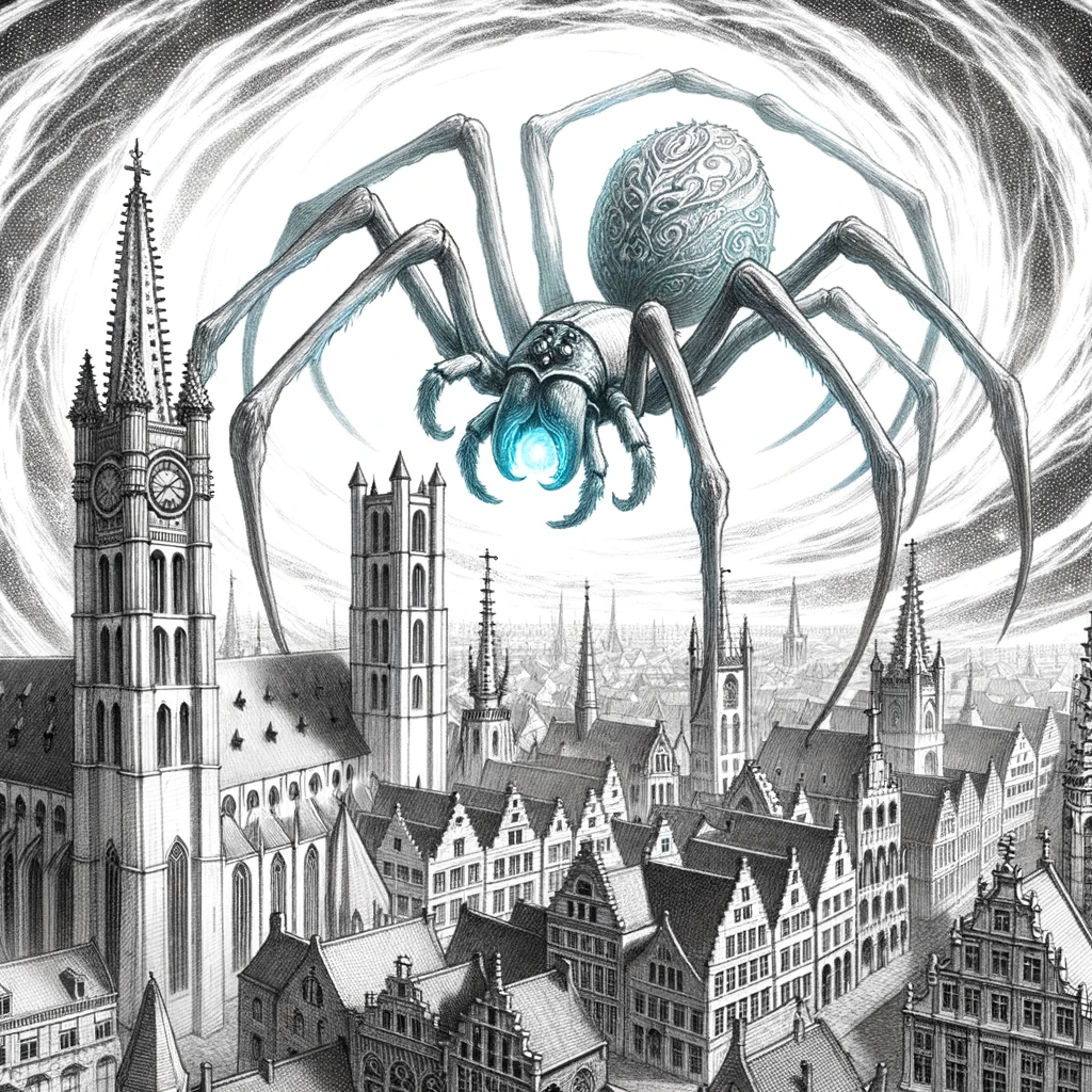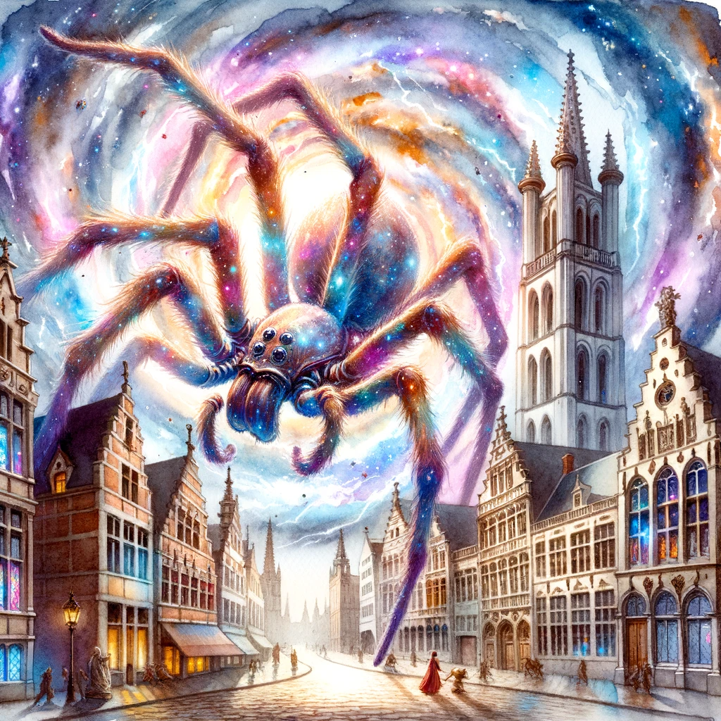 Watercolor painting of medieval Ghent under siege by a giant magical, time-travelling spider. The spider, with shimmering and ethereal colors, emerges...