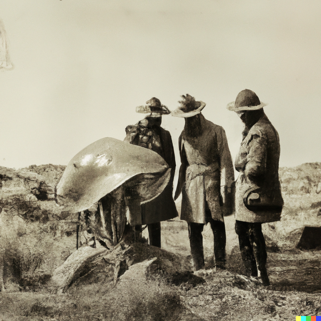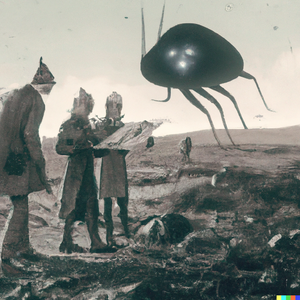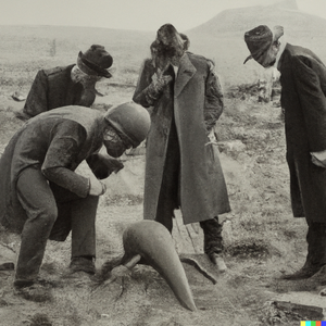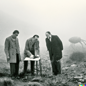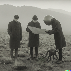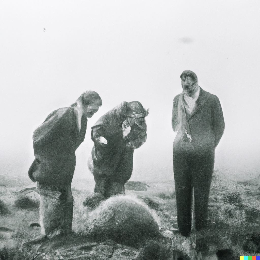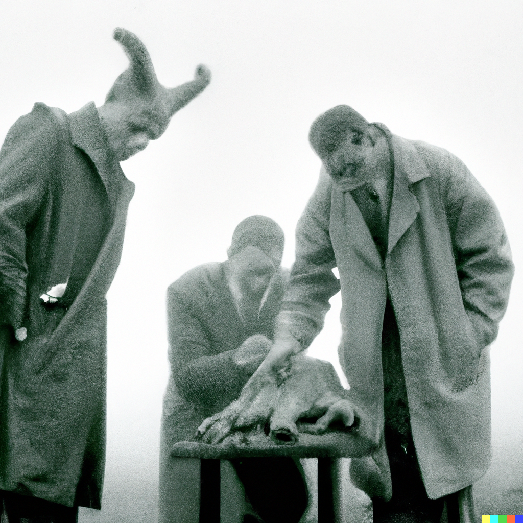 Grainy 1930s newspaper photograph of an alien creature spotted on the moors in Scotland, being examined by two serious-looking scientists. The scene...