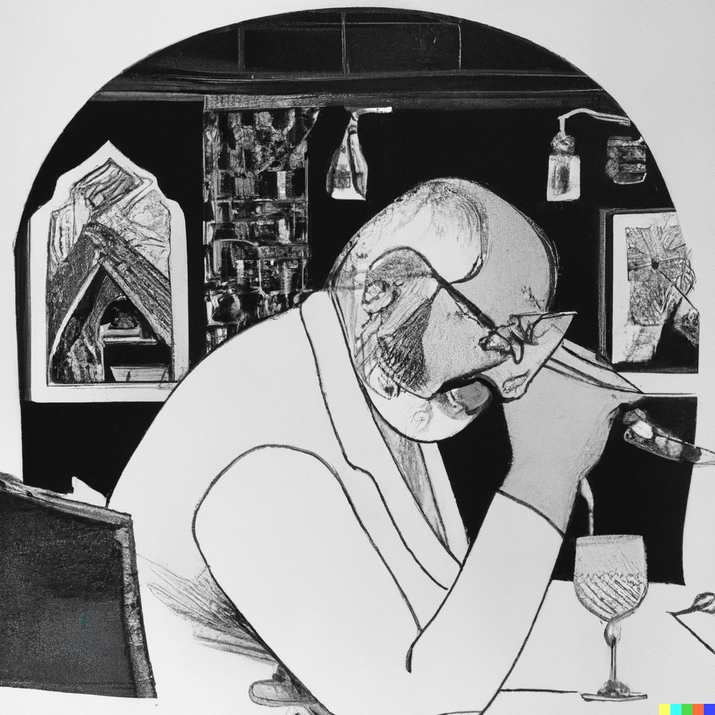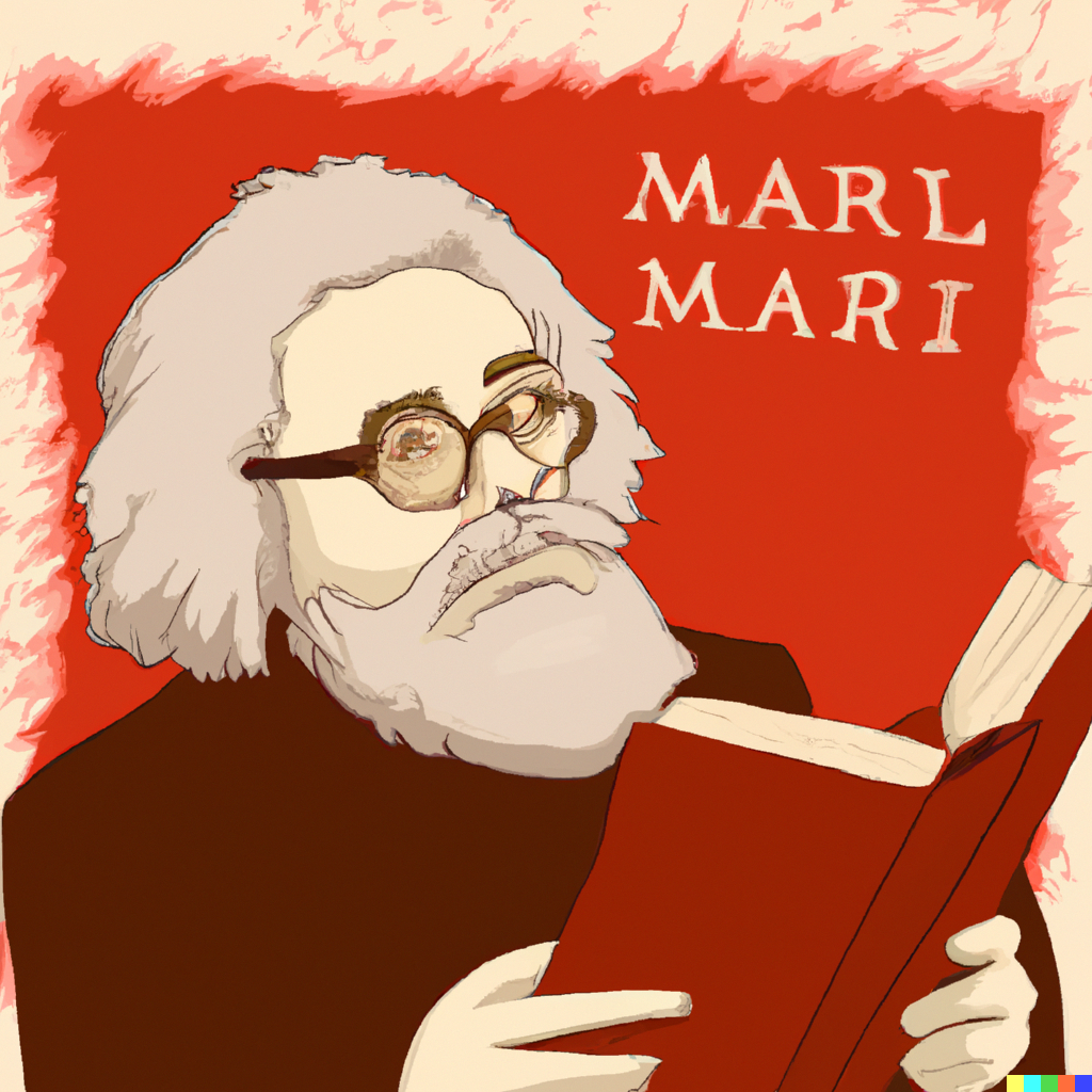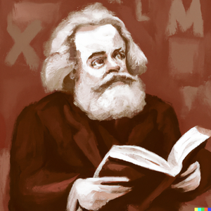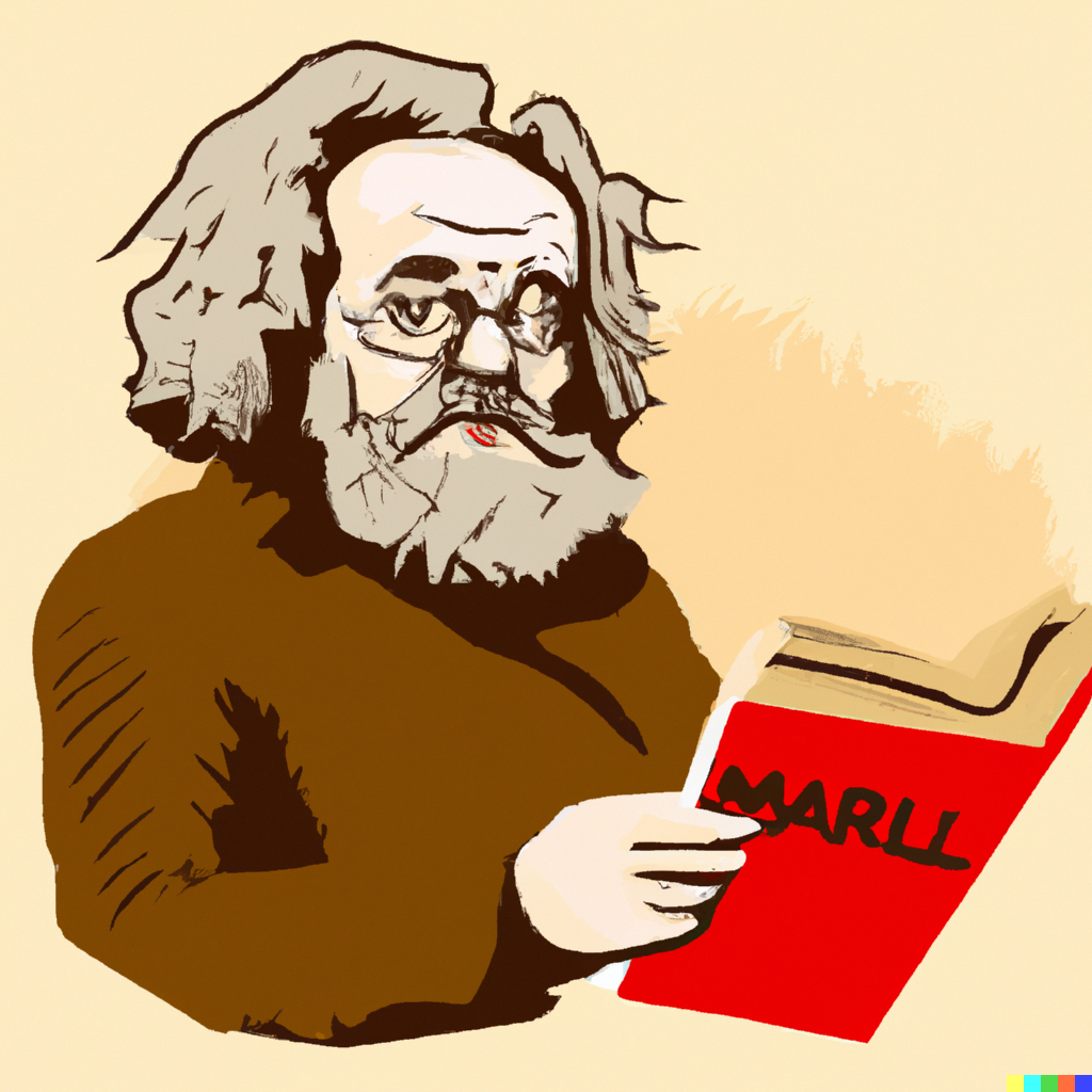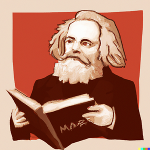 A portrait in classical style of Karl Marx reading a book.