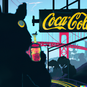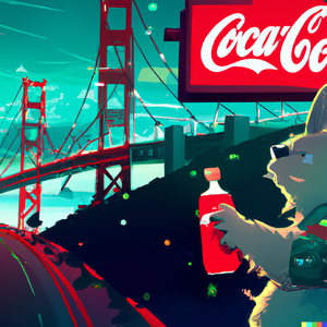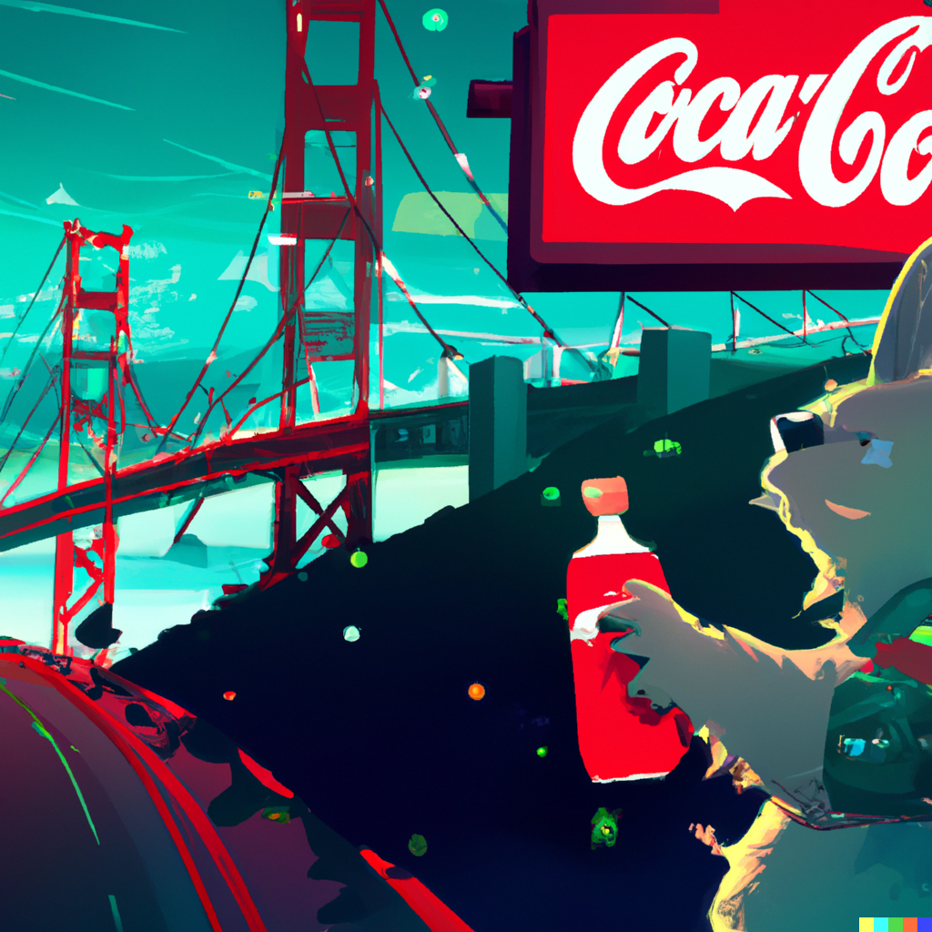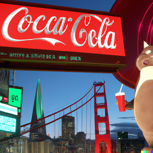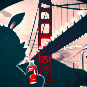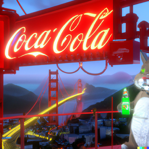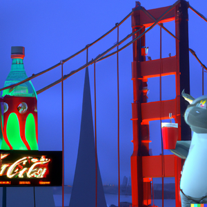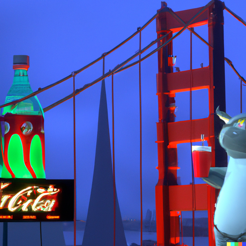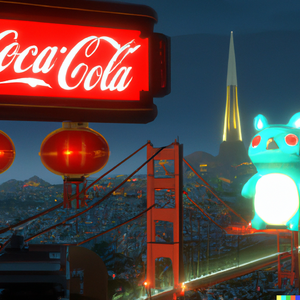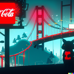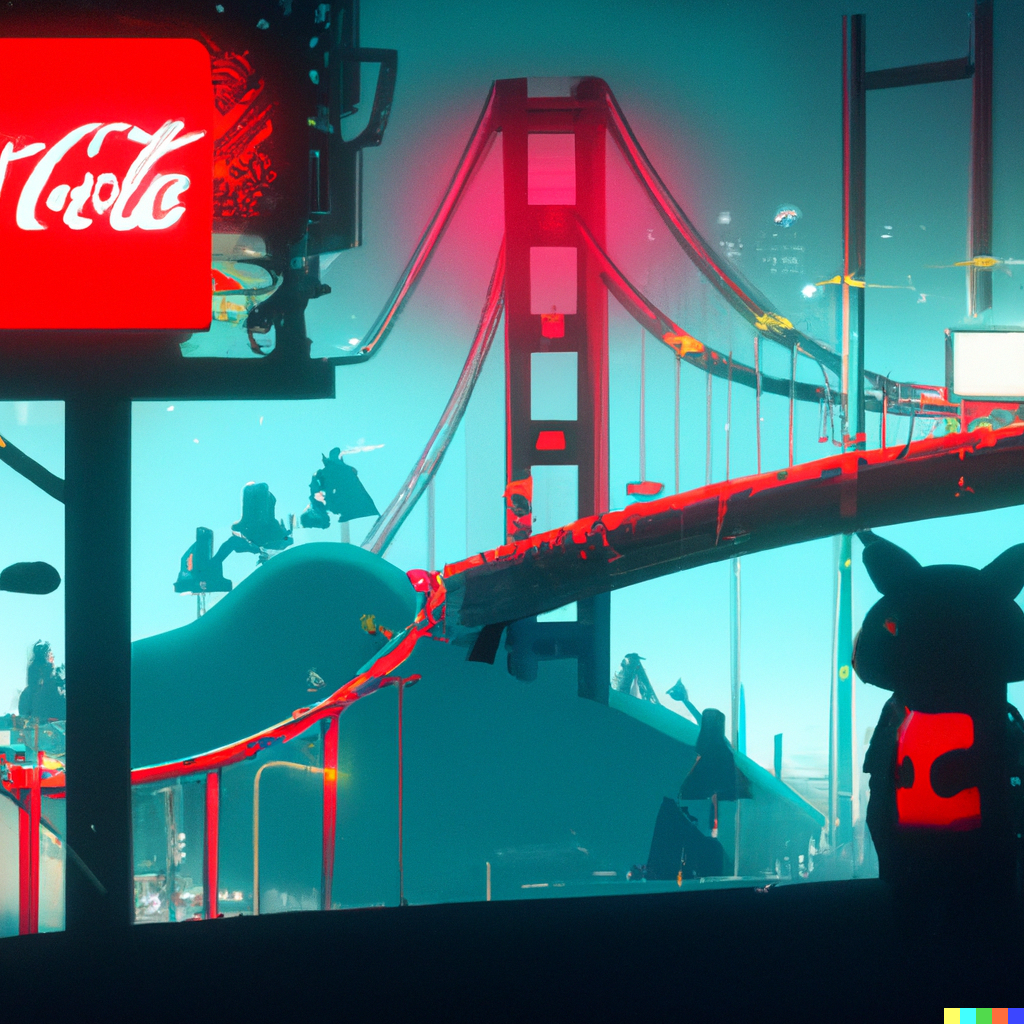 Totoro in a futuristic San Francisco cyberpunk cityscape, neon signs advertising Coca-Cola and movies by Studio Ghibli, the Golden Gate Bridge visible