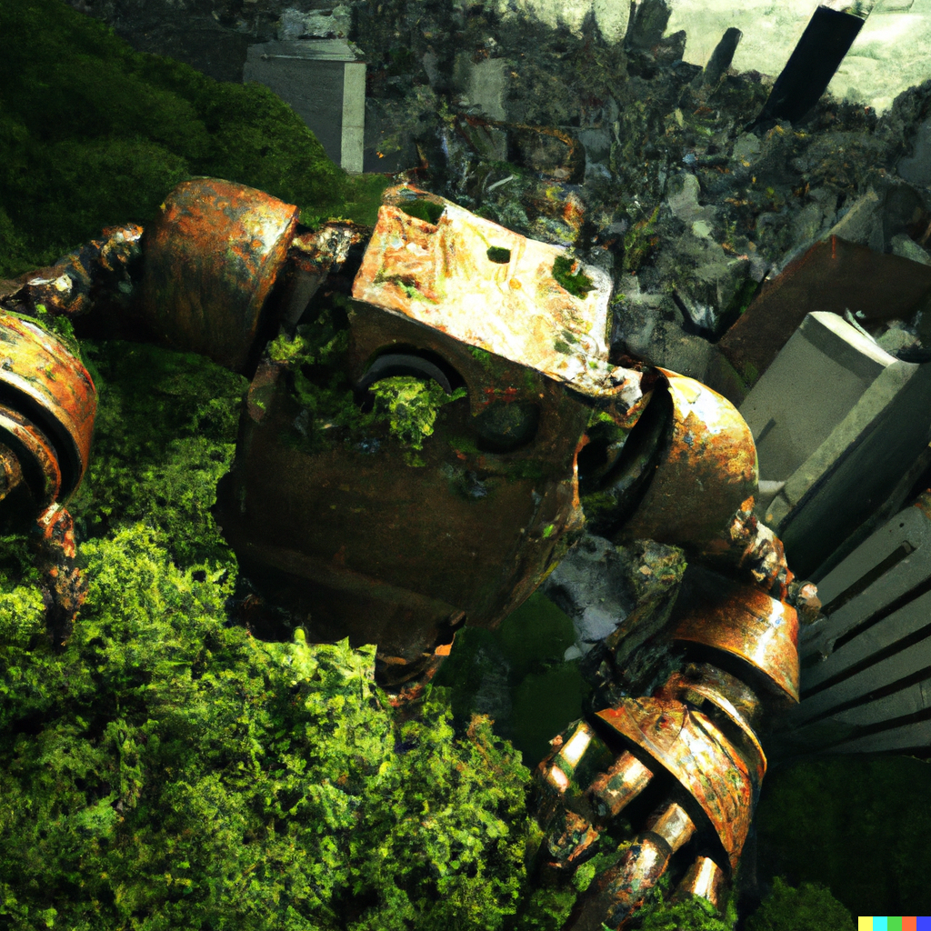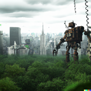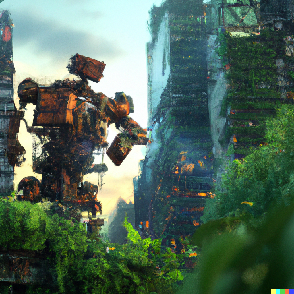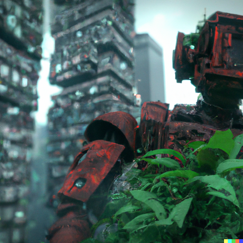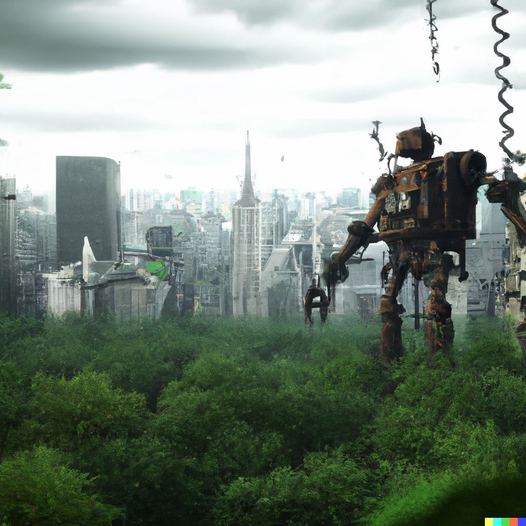 A large rusty robot looms over a realistic city being overgrown by greenery after an apocalypse, skyscrapers, high detail, vibrant, cinematic lighting