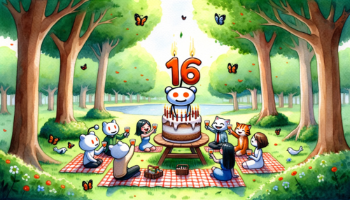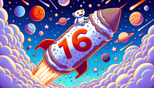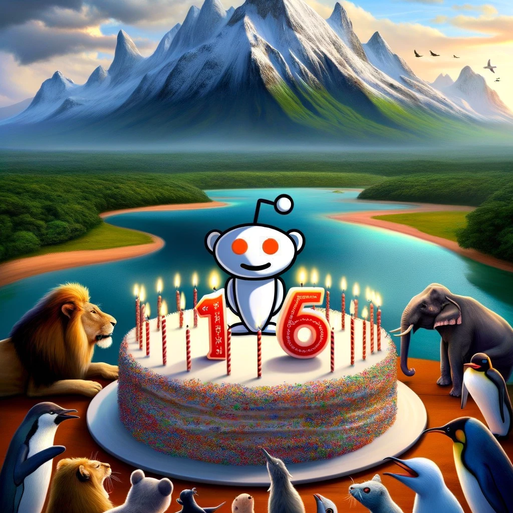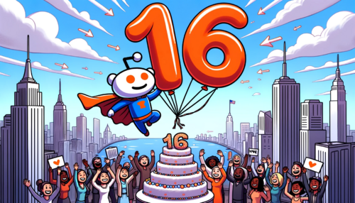 Cartoon of a Reddit snoo dressed as a superhero, flying above a city skyline holding a giant '16' shaped balloon. Citizens of various genders and...