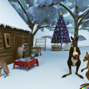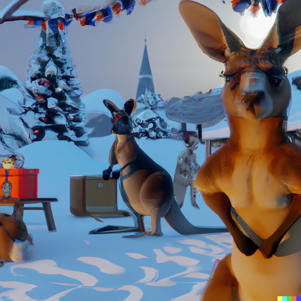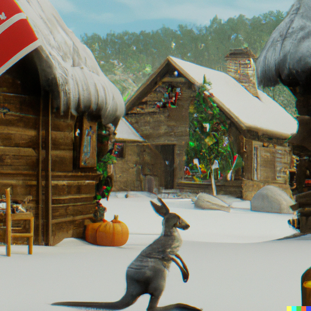 A traditional Norwegian Christmas scene with a curious kangaroo. Hyper-realistic, Deviantart. 4K.