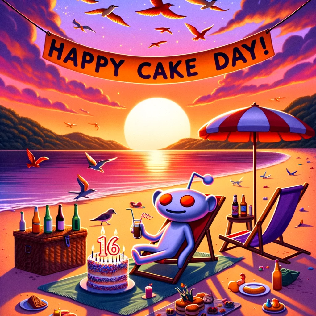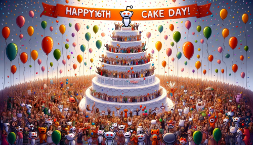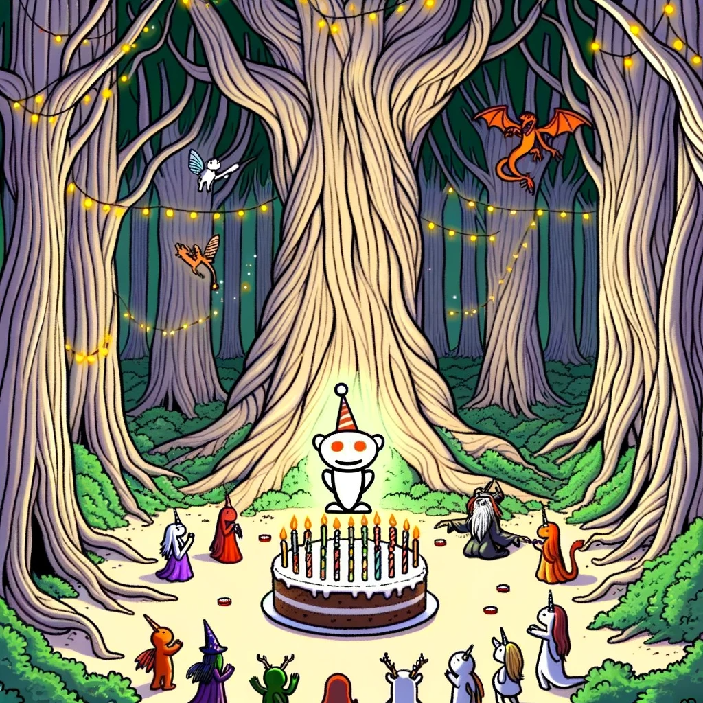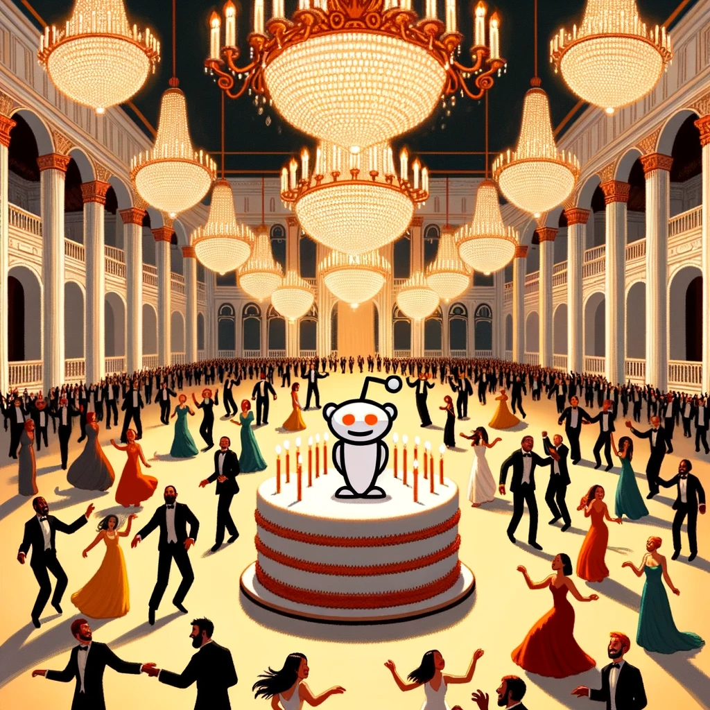 Photo of a grand multi-tiered cake with a tiny Reddit logo on top, surrounded by diverse groups of cartoon characters, all singing and dancing in a...