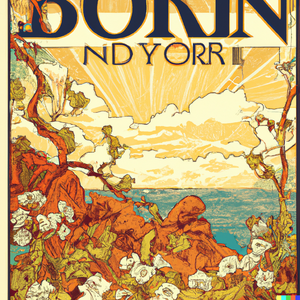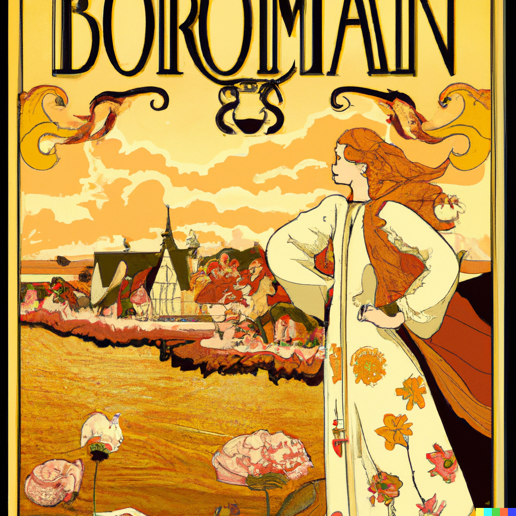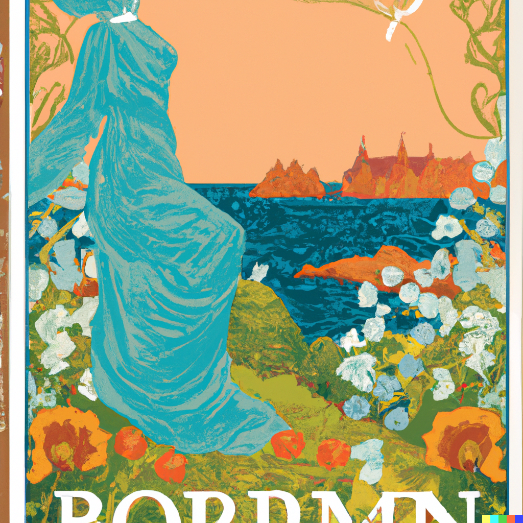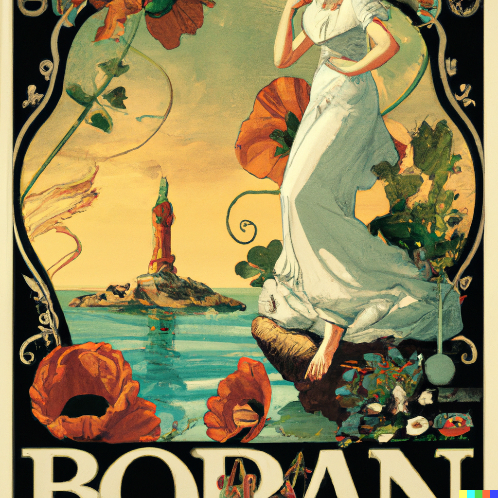 Vintage travel poster for the Danish island Bornholm in the art nouveau style of Alfons Mucha.