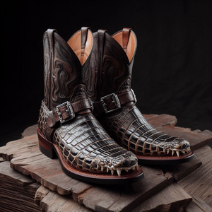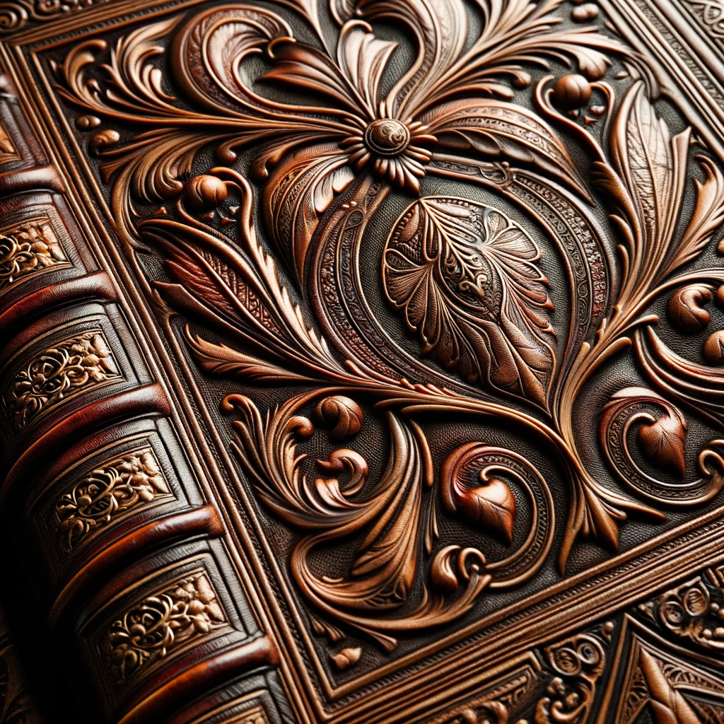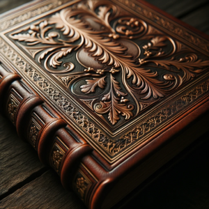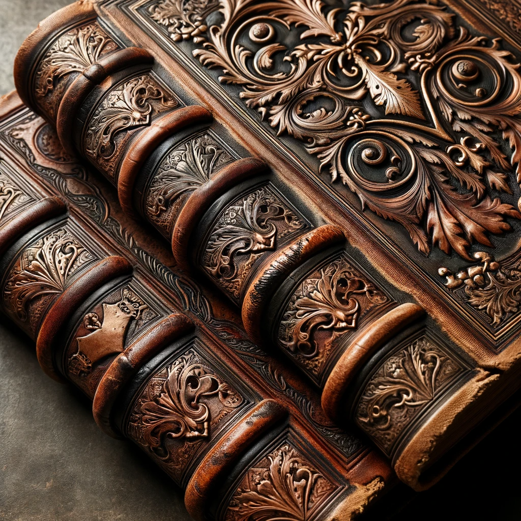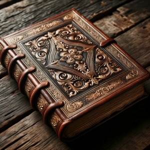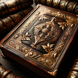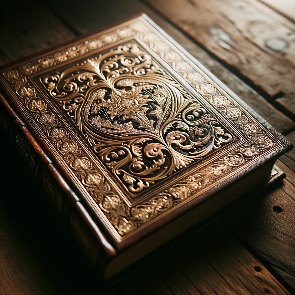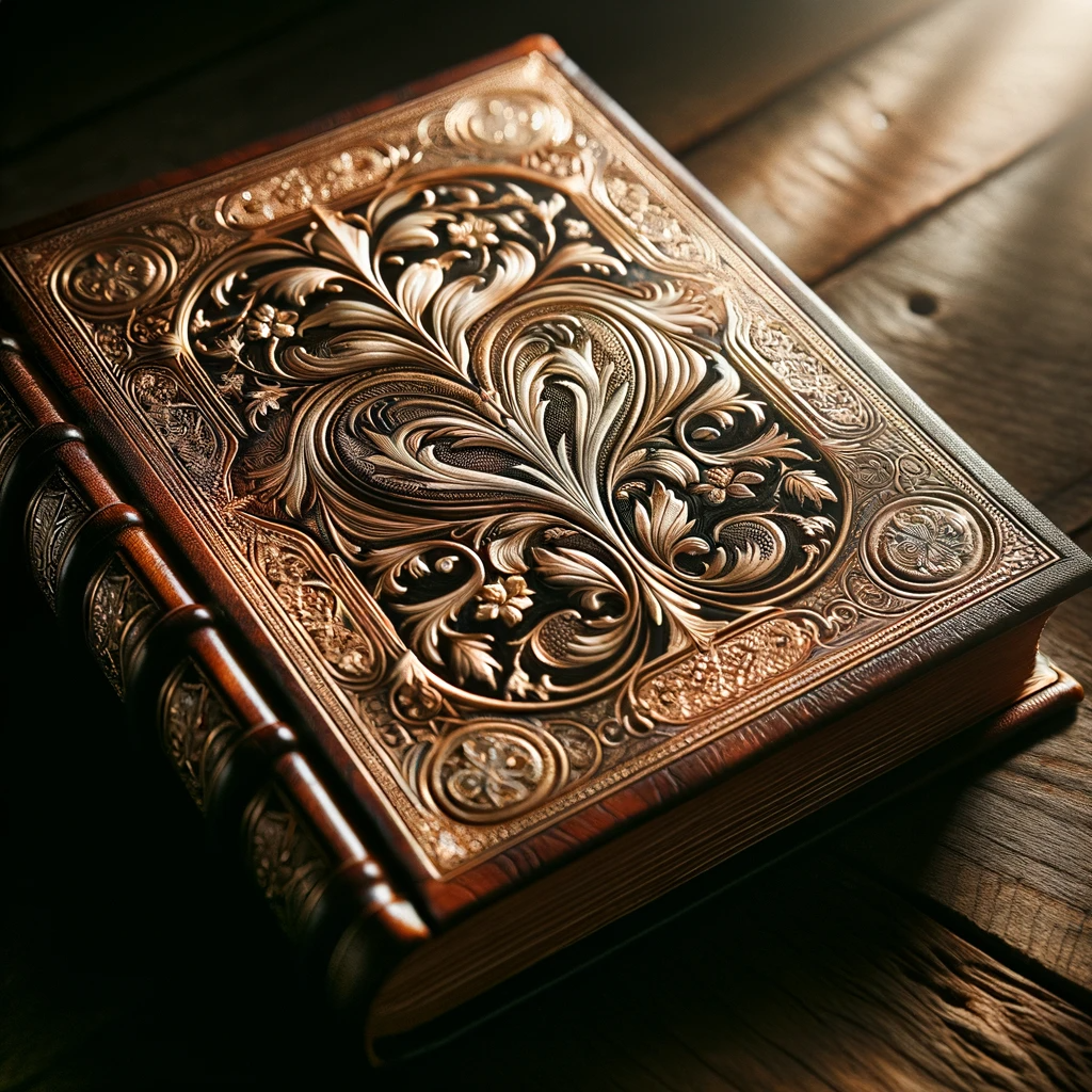 Photo of an aged leather-bound book with intricate gold embossing on the cover, resting on a wooden table.