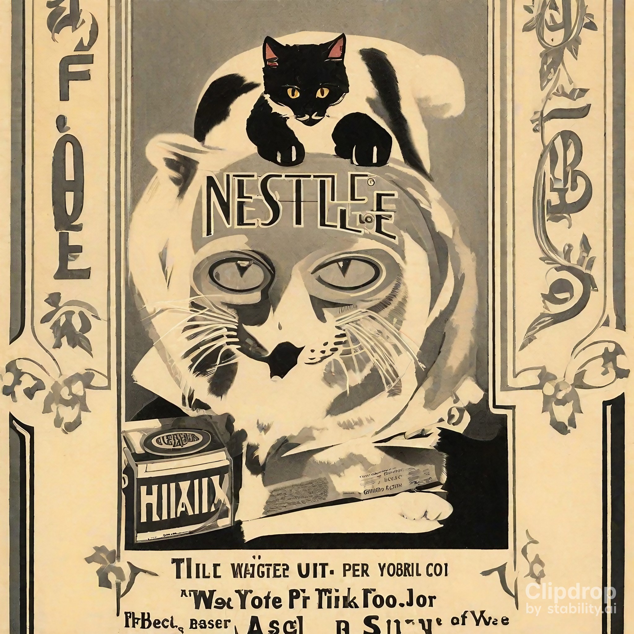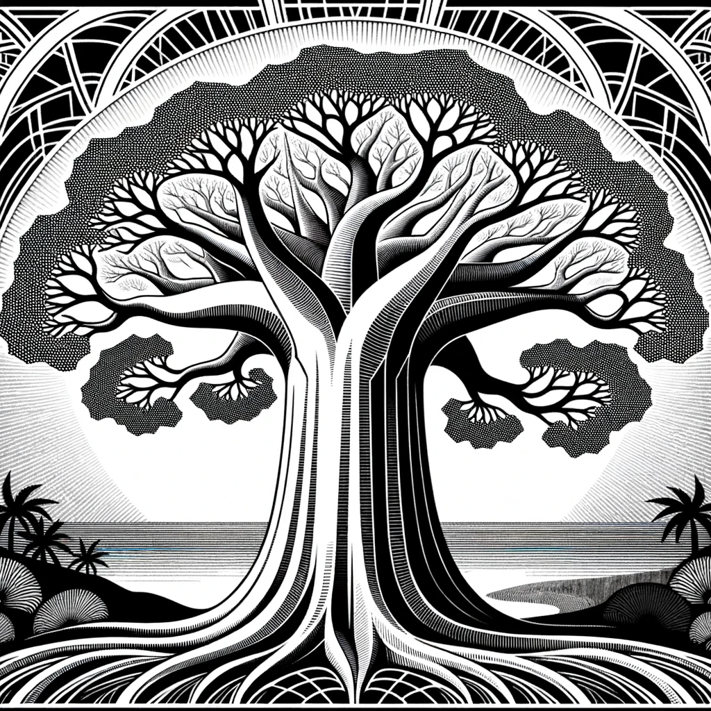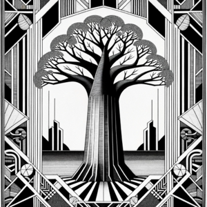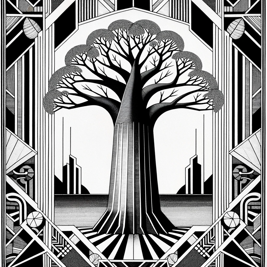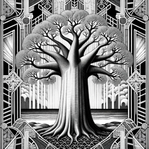 Black and white etch in the Art Deco style depicting a majestic baobab tree. The design is reminiscent of early 20th-century aesthetics with intricate...