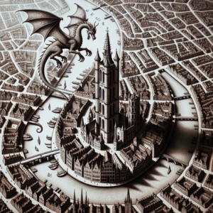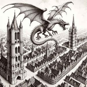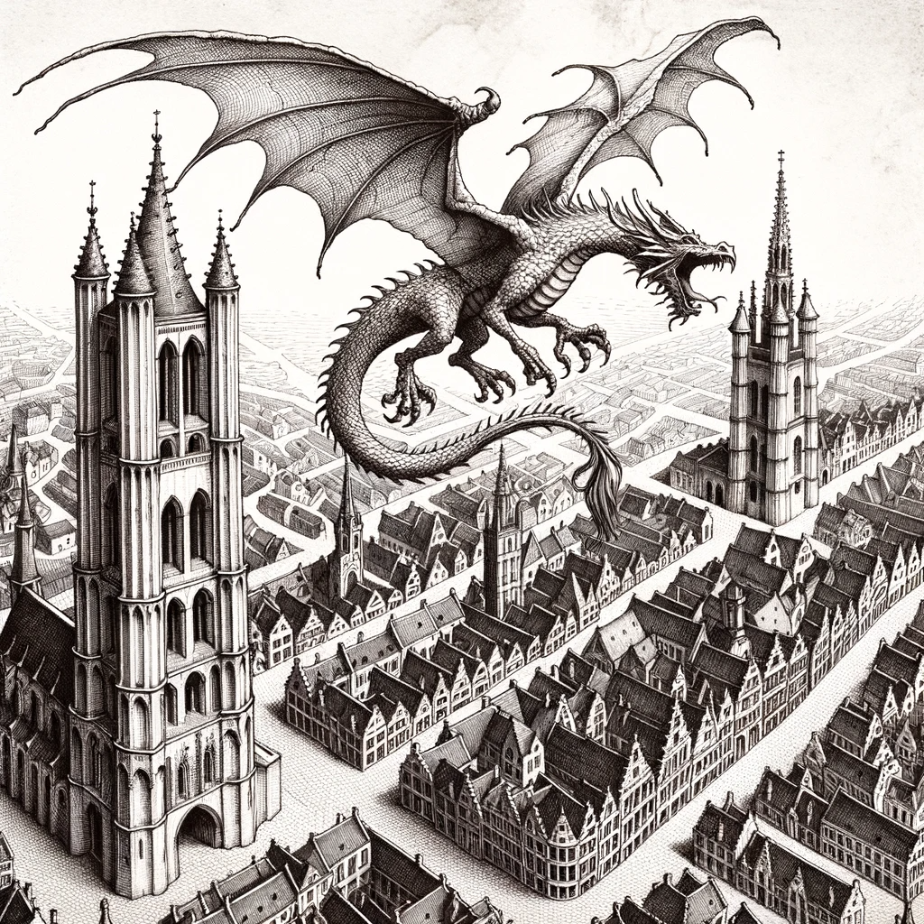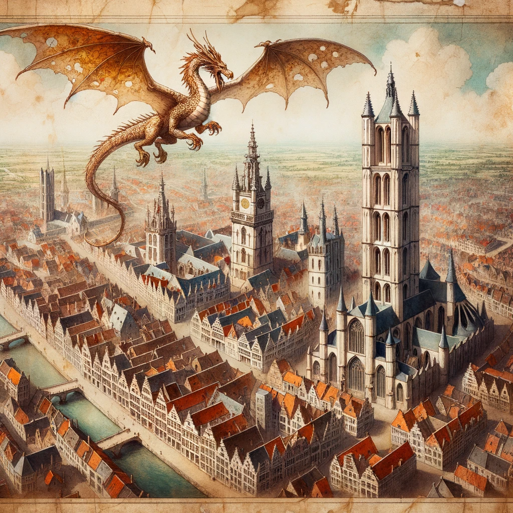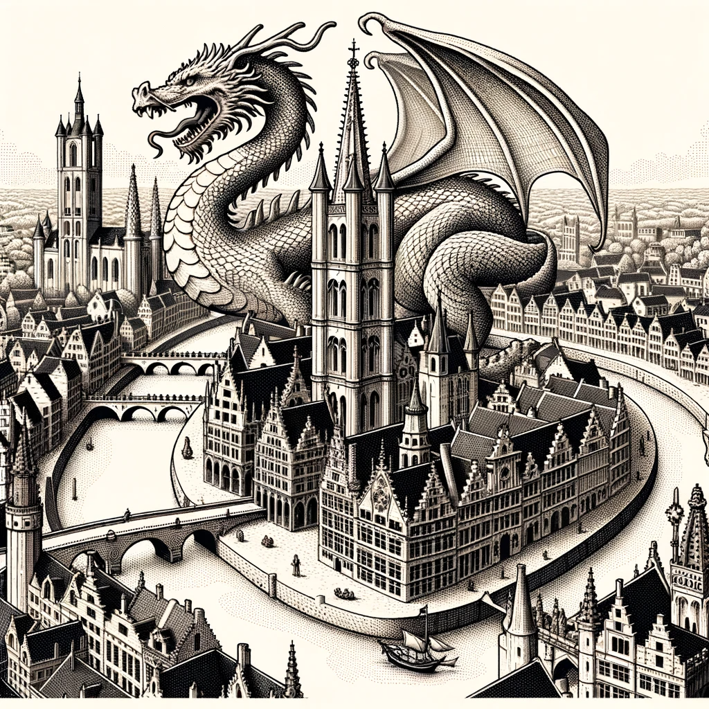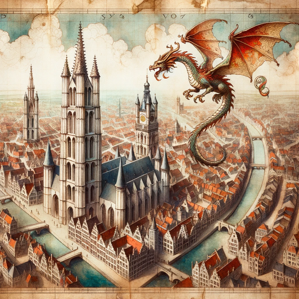 Drawing of a medieval Ghent city map. The streets are intricately sketched, and landmarks like churches and fortresses are detailed.