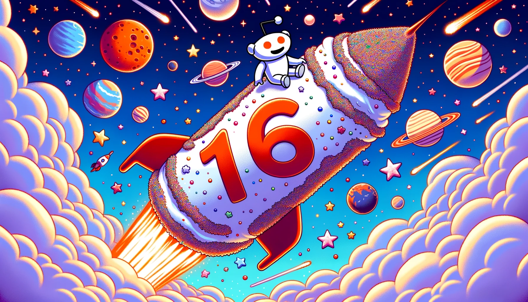 Illustration of a Reddit mascot riding a massive rocket shaped like a cake, soaring into a sky filled with stars, planets, and other celestial bodies