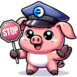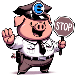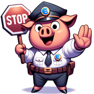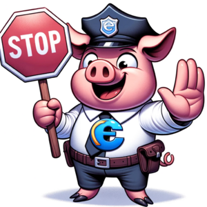 Cartoon illustration of a cute pig wearing a policeman's hat with the Internet Explorer 6 logo on it. The pig is holding a hand-held stop sign and