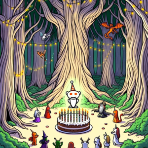 Cartoon drawing of a magical forest. Tall, ancient trees with their branches intertwined, creating a canopy. Beneath, a clearing reveals a party setup