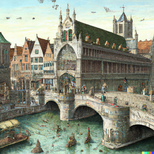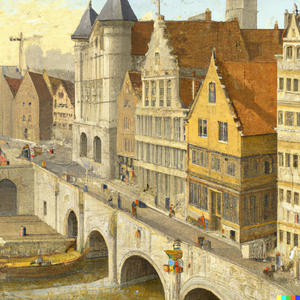The Sint-Michielsbrug in Ghent with the Korenmarkt in the distance, drawn in the style of Albrecht Dürer. artstation trending 4k